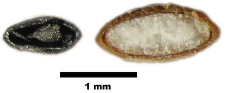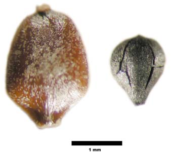 Top left Cyperaceae type Dja'de 167, Carex hostiana (in section). Top right fresh Carex glauca. Bottom Carex hostiana and Cyperaceae type Dja'de 167.Given the problems of charring and the large number of species it is only possible to identify to genus or species levels with exceptional preservation. |
