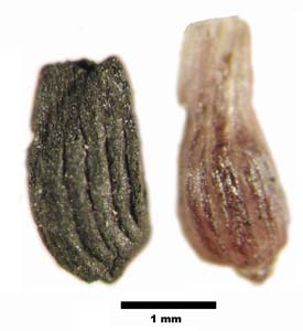 Left unidentified plant part which resembles a bract from Poa bulbosa Jerf el Ahmar 613. right modern bract from a bulbil of Poa bulbosa. |