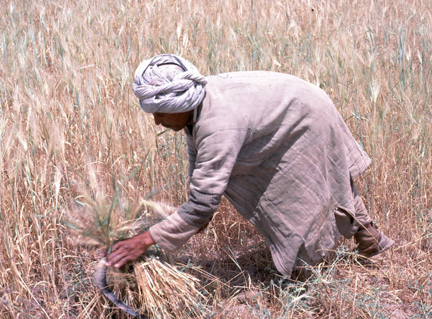 Sickle harvesting by hand of a barley field in the spring, near the site of Shortughai, Oxus valley, northern Afghanistan.