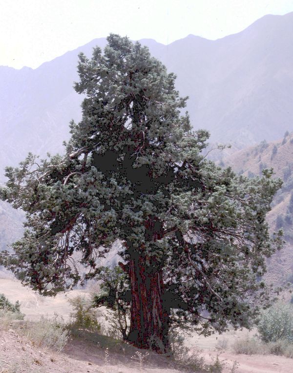 An isolated specimen of Juniperus seravschanicain in the mountains of Tajikistan north of Doushambe. This specids of Juniper is part of J.excela complex and it is threatened by grazing and felling.