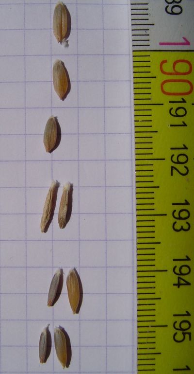 Wild einkorn (Triticum boeoticum ssp thaoudar) collected in the Karaca Dag basalt region of eastern Turkey. In the field several ears were dehusked to expose the grains. Individual ears contained some spikelets with two grains others one grain each with their characteristic shapes. In this case the upper spikelets contained single grains and the lower spikelets two grains. 2007 |